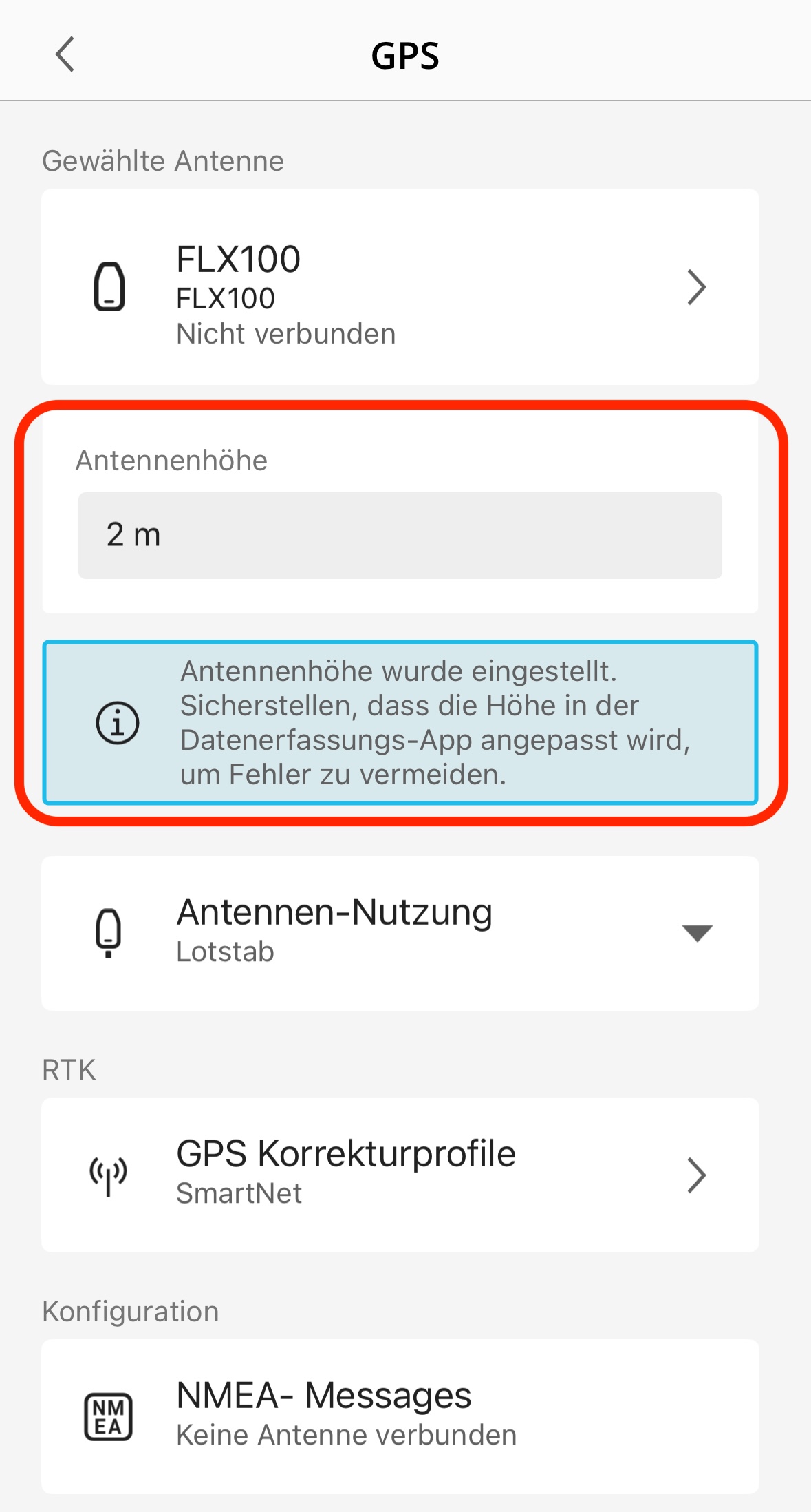 Bei Empfängern mit Tilt-Funktion berechnet Zeno Connect die Position inklusive Korrektur der Schräglage. Damit diese Berechnung stimmt, muss die Antennenhöhe direkt dort korrekt angegeben werden.