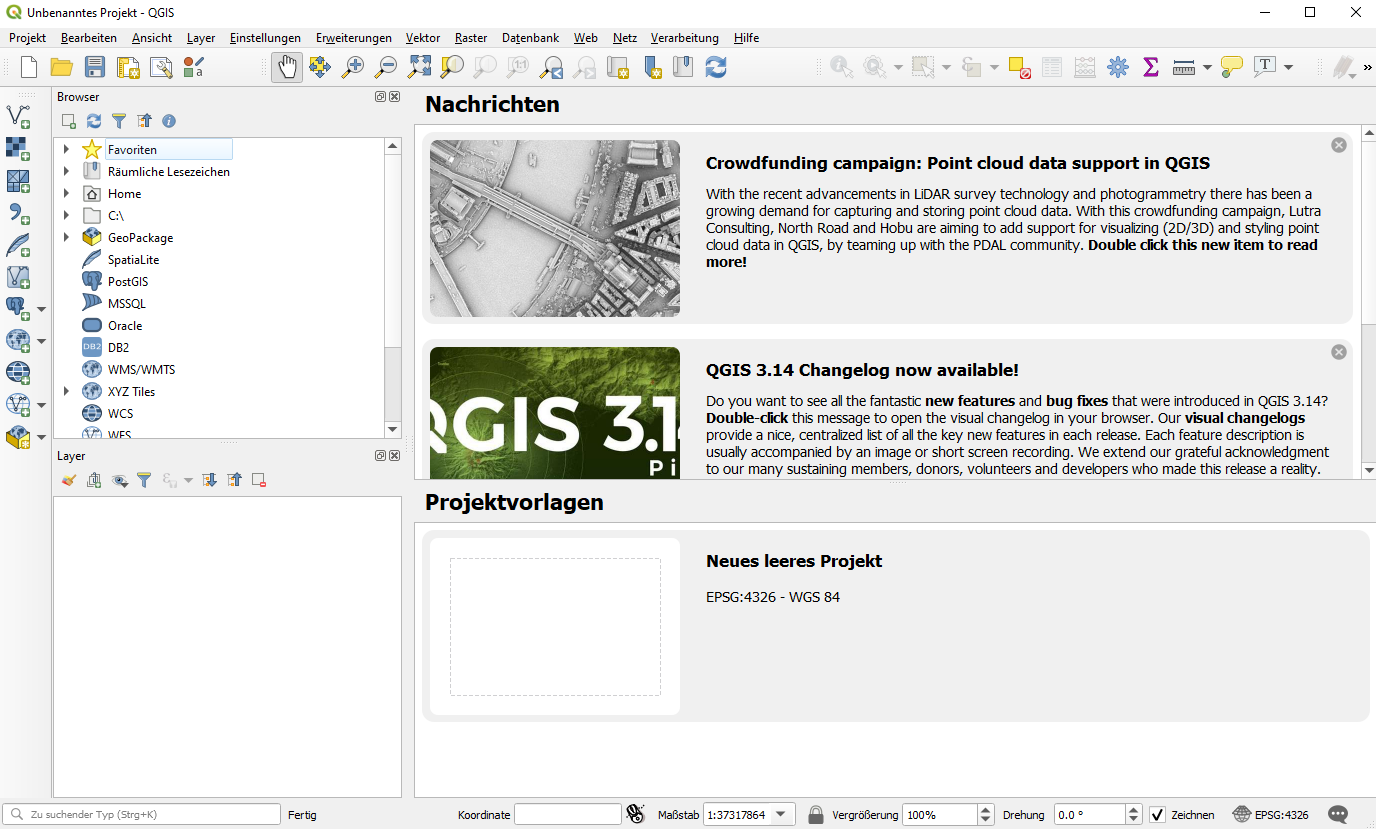 Im Browserfenster kann man zum gewünschten Speicherort navigieren und ein bestehendes QGIS Projekt (*.qgz Datei) öffnen. Danach erscheinen die Daten im Kartenfenster und die entsprechenden Layer im Layerfenster: