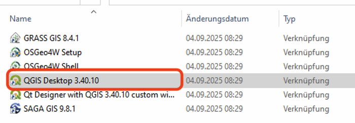 Nachdem QGIS erfolgreich installiert wurde befindet sich am Desktop ein QGIS Ordner mit mehreren Verknüpfungen. Zum Ausführen von QGIS öffnen Sie die entsprechende Verknüpfung mit dem grünen QGIS Symbol: